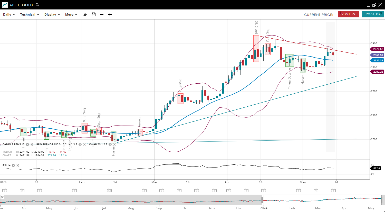 Gold has shifted from a positive to a neutral trend and continues to consolidate, albeit with an upwards bias, with the price increasing slightly to 2,351, now above the previous VWAP of 2,329. Support has adjusted slightly higher to 2,282, while resistance has decreased to 2,376. The RSI has increased to 57, indicating a cooling in sentiment.