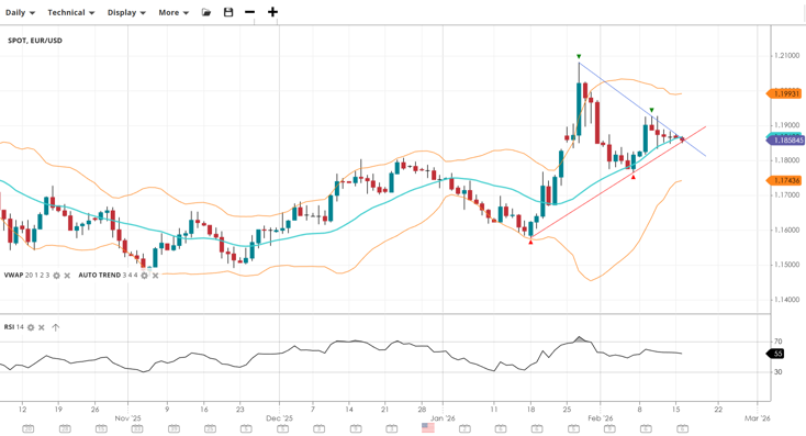 Gold has stabilised following the extreme volatility seen in early February. It is trading back above the 4,900 level and the VWAP (4,923). Momentum has recovered with the RSI at 53, suggesting the worst of the sell-off may be over, though resistance at 5,391 remains a significant hurdle.