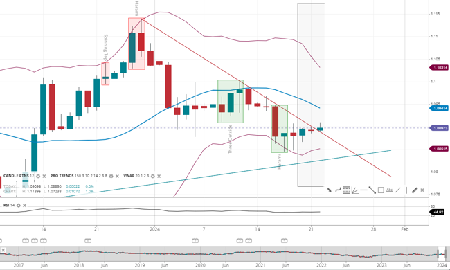EUR/USD is now in a bearish trend, with prices having fallen 2 standard deviations below the 20-period VWAP of 1.089. Support and resistance are at 1.085 and 1.103, respectively. The RSI is at 44, which offers little in the way of signalling power with regards to momentum.