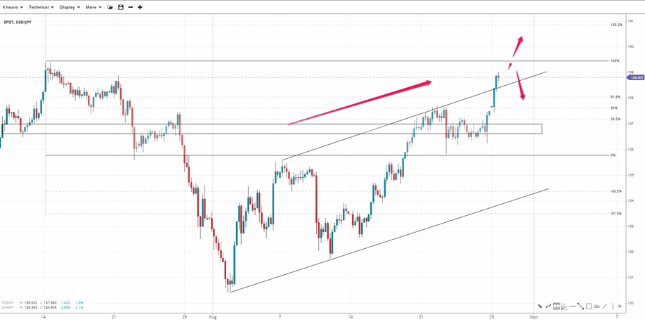 USD/JPY continues to accelerate with a break above the 139,50 top being primarily bullish. The 138.2 Fibonacci extension of the 139,50-135,80 leg near 141,00 is intermediate resistance. A pullback before there would expose 137,00 if the supply zone around 138,00 weakens. The upward move above the channel suggests a trend acceleration.