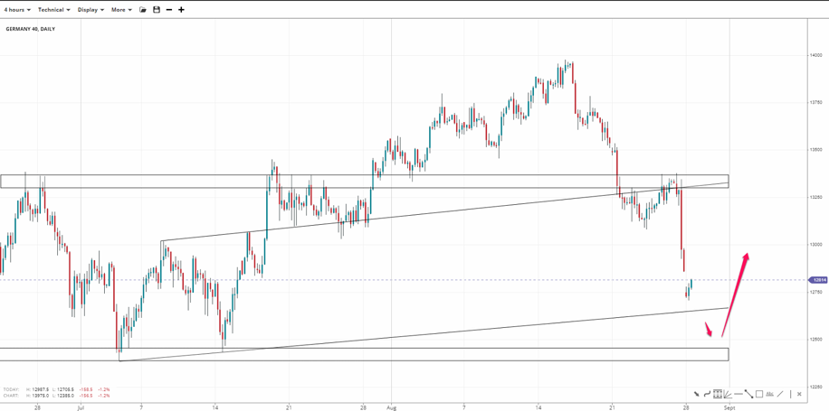 Germany 40 lost the support at 13,000 after bulls received rejection at the channel top near 13,300. The former is now major resistance and the 12,600 channel bottom offers key support. Breaching the channel downwardly might offer a near-term bounce following a double-bottom at 12,400.