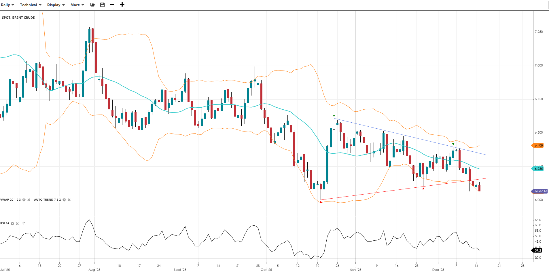 Brent Crude Oil appears to be breaking lower, currently testing the lower bounds of its recent range, trading at 6,235, below its VWAP of 6,067. The RSI at 37.2 indicates more intensely bearish momentum. Support is at 6,235, with resistance at 6,408.