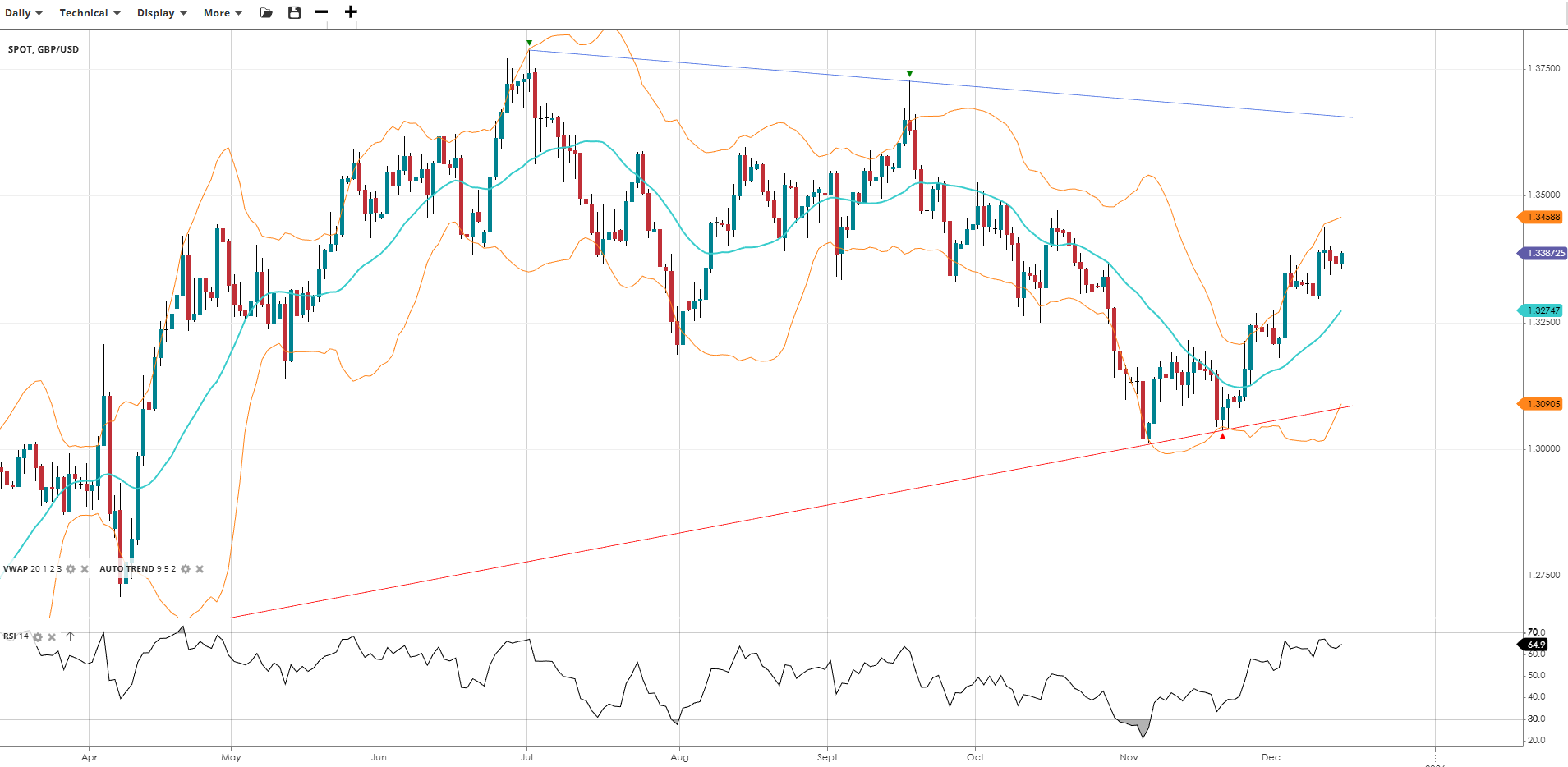 GBP/USD is moving back higher within its sideways range, trading at 1.3387, above its VWAP of 1.3275. The RSI at 64.9 indicates strong momentum. Support is at 1.3091, with resistance at 1.3459.