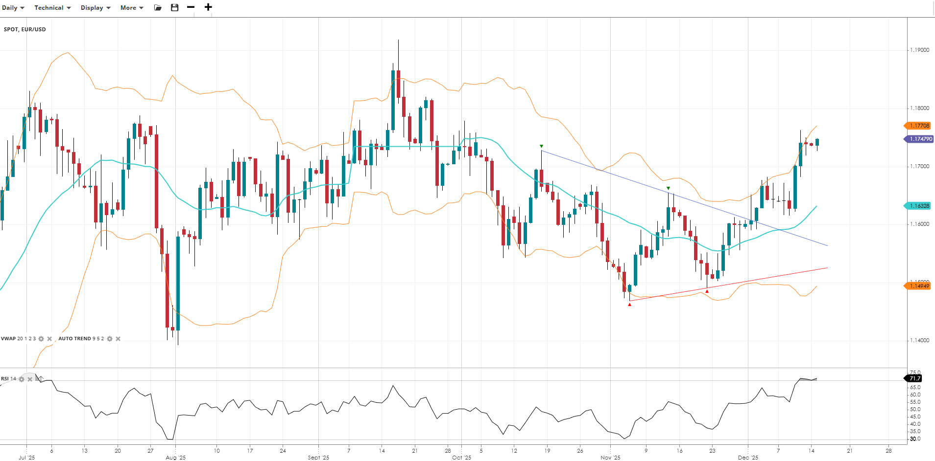 EUR/USD is likewise in a bullish near term trend within a broader range, trading at 1.1748, above its VWAP of 1.1633. The RSI at 71.7 indicates strong momentum. Support is at 1.1495, with resistance at 1.1771.