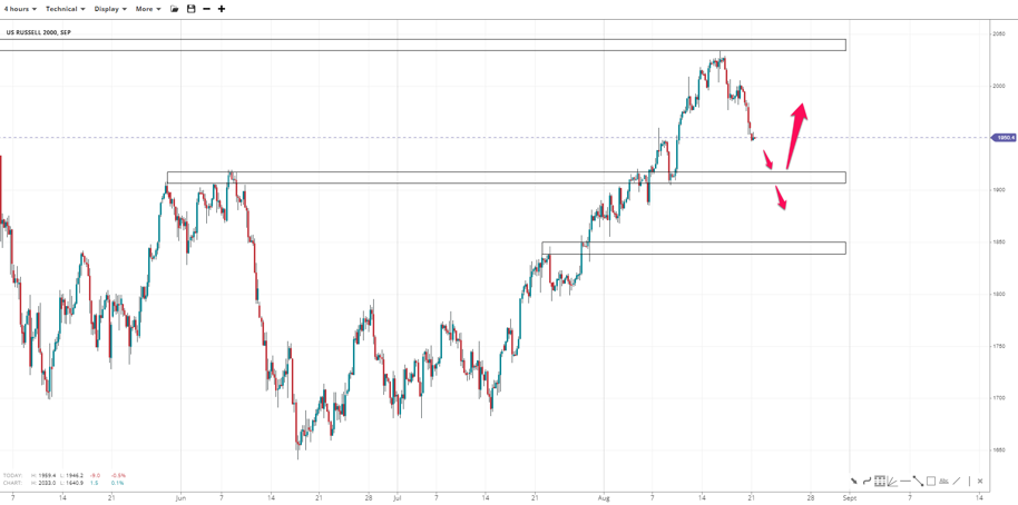 Russell continues to descend after failing to break 2,000, forming a false break. The round level failed to turn into support and further movement to the downside is expected to test 1,900 in the coming days. If the support is weak, a close below would increase appetite for a drop to 1,850, otherwise, a bounce toward the 2,000 might take place. If it flips to resistance, the bearish trend could continue.