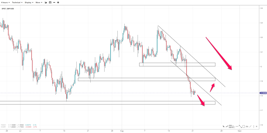 The bearish channel formation of GBP/USD successfully accelerated the trend after breaking outside the lower band. The market is likely to test the local low near 1.1760 and possibly slide lower towards 1.1700 before a short-term reversal could ensue. If bulls manage to hold the line, it could lead the pair towards the 1.20 mark, where we expect at least an initial rejection, if bulls successfully reenter the channel.