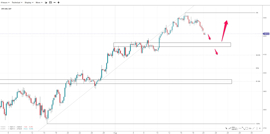 SPX 500 hit a local top after finding sellers above 4,350 and is printing lower lows towards the 4,200 mark. If the market continues its downward move toward the 4,100 mark a test of the 38.2% Fibonacci at 4,100 can be expected. Inversely, rising momentum would offer a chance at 4,000. A rise above 4,250 will increase bullish sentiment and might negate this bearish view.
