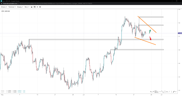 The decline shown on the 4-hour cable chart suggests a leading wedge pattern may be due as price action appears to overlap in a downward slope. 1.2680 is a possible support above the low of 1.26, with resistances ahead at 1.2780 and the peak of 1.2841.