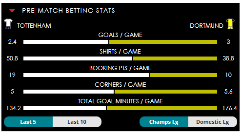To see all the Tottenham v Dortmund betting stats and form, visit our pricing page to view our Pre-Match betting stats table or hover over/tap the chart image to see previous outcomes for that particular market.