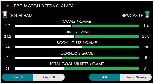 To see all the Tottenham v Newcastle betting stats and form, visit our pricing page to view our Pre-Match betting stats table or hover over/tap the chart image to see previous outcomes for that particular market.